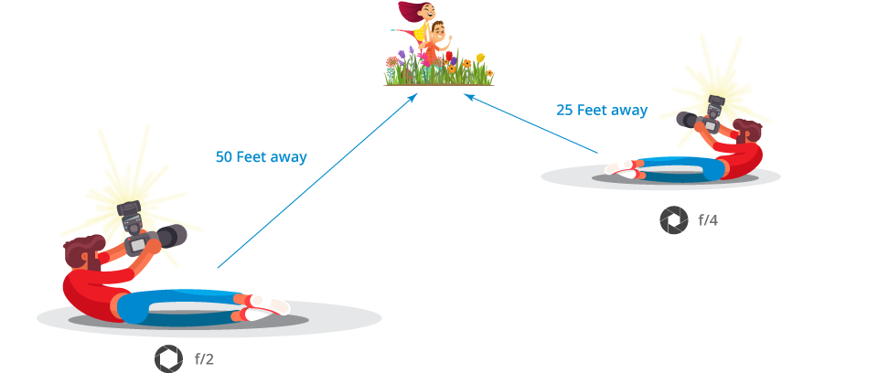 برای ساده‌سازی این موضوع، فرض کنید سوژه‌ی عکاس ما در فاصله‌ی ۲۵ فوتی (۷.۶ متری) قرار دارد و قصد داریم با فلاشی که عدد راهنمای آن ۱۰۰ است از آن عکس بگیریم. طبق فرمول پاراگراف قبلی، عکاسی از این سوژه به دیافراگم f/4 نیاز دارد. همچنین اگر سوژه در فاصله‌ی ۵۰ فوتی (۱۵ متری) قرار بگیرد باید از دیافراگم f/2 استفاده نمود.
