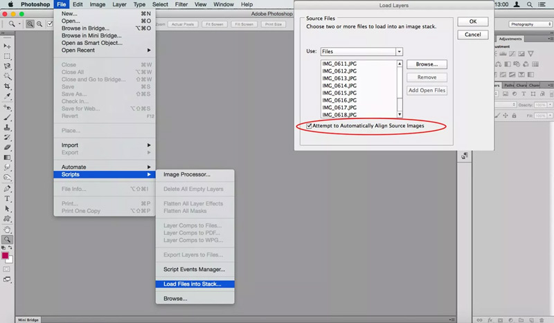 در پنجره‌ای که به نمایش در می‌آید، گزینه‌ی Files را انتخاب کرده و سپس با فشردن دکمه Browse تصاویر موردنظر را باز نمایید. بهتر است گزینه Attempt to Automatically Align Source Images را فعال کنید، به‌خصوص اگر با سه‌پایه عکس نگرفته‌اید. با این کادر، فتوشاپ می‌تواند عکس هایی که کمی تغییر کادر داشته‌اند را بهتر روی هم قرار دهد. حتی در صورت عکاسی با سه‌پایه هم استفاده از این گزینه می‌تواند تغییر زاویه‌ی دید لنز و مقیاس تصویر به هنگام تغییر فوکوس (موسوم به focus breathing) را جبران نماید.