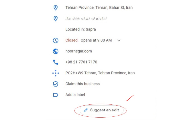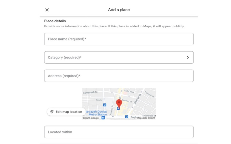 در بخش آدرس هم باید آدرس دقیق مکان را بنویسید. بهتر است آدرس را خودتان وارد کنید چون ممکن است آدرس گوگل دقیق نباشد.