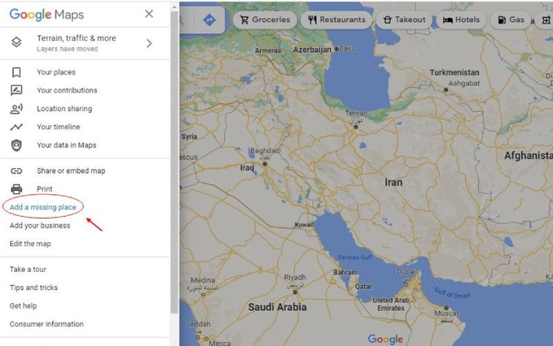 در پایین این منو گزینه Add a missing place را انتخاب کنید.