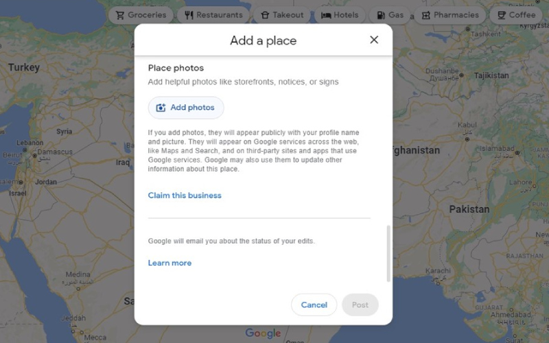 در قسمت افزودن تصاویر، می‌توانید تصاویری واقعی از دفتر شرکت یا کسب‌وکار خودتان ارسال کنید. این تصاویر هم کمک می‌کند مکان افزوده شده زودتر تایید شود و هم این که در کسب اعتماد مخاطبان شما تأثیری مثبت خواهد داشت.