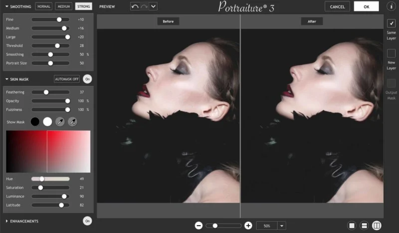 این روز‌ها کافیست سری به شبکه‌های اجتماعی بزنید و با حجم زیادی از عکس‌های پرتره روبرو می‌شوید که به دلیل رتوش بد و نابجا، پوست صورت را تبدیل به سطوحی صاف و پلاستیکی و مو‌م گونه کرده‌اند. این دلیل استفاده نادرست از بسیاری از نرم‌افزارهای خودکار رتوش است که خوشبختانه برنامه Portraiture 3 جزو آن‌ها نیست.