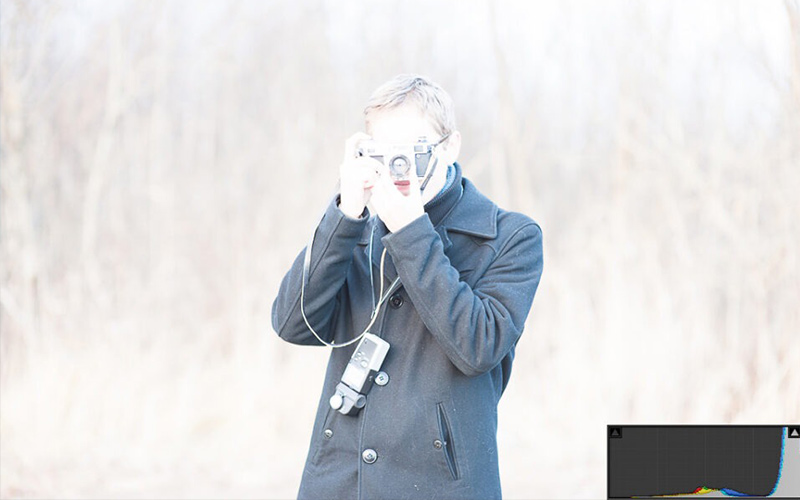 تصویر زیر بیش از حد نوردهی شده است. در این تصویر، هیچ بخش تاریک و سیاهی وجود ندارد و بخش زیادی از آن، کاملاً سفید بوده و هیچ جزئیاتی ندارد. هیستوگرام آن هم به سمت راست کشیده شده است. در این هیستوگرام، تنهای میانی مربوط به کت شخص هستند که رنگ اصلی کت (رنگ مشکی) را نشان نمیدهند.