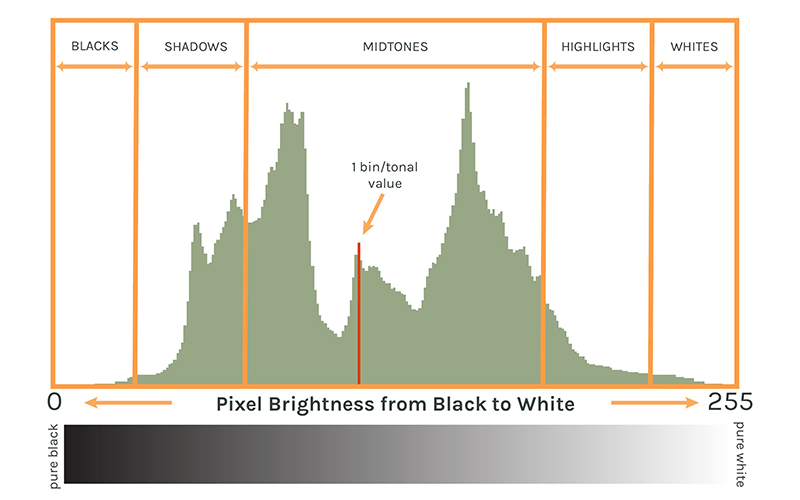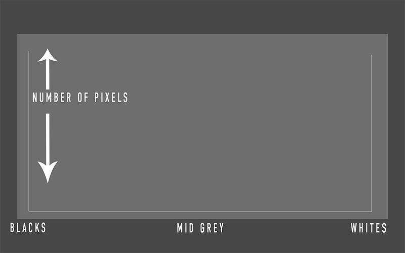 اگر به تصویر زیر دقت کنید، یک محور افقی در آن خواهید دید. هر چه روی این محور از سمت چپ به راست بروید، تنالیتههای روشنتری را خواهید یافت. بهطور کلی سمت چپ هیستوگرام، نشاندهنده تنالیتههای تاریک، میان آن نشاندهنده تنالیتههای میانی و سمت راست، نشاندهنده تنهای روشن است.