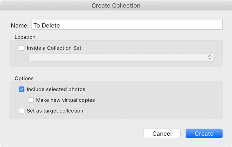 قدم بعدی ساخت یک کلکسیون و قرار دادن عکسهایی که میخواهید حذف کنید در آن است. برای این کار به مسیر Library -> New Collection مراجعه کنید و سپس برای آن یک اسم انتخاب کنید. قبل از کلیک کردن روی گزینه Create مطمئن شوید که گزینه Include Selected Photos تیک خورده باشد.
