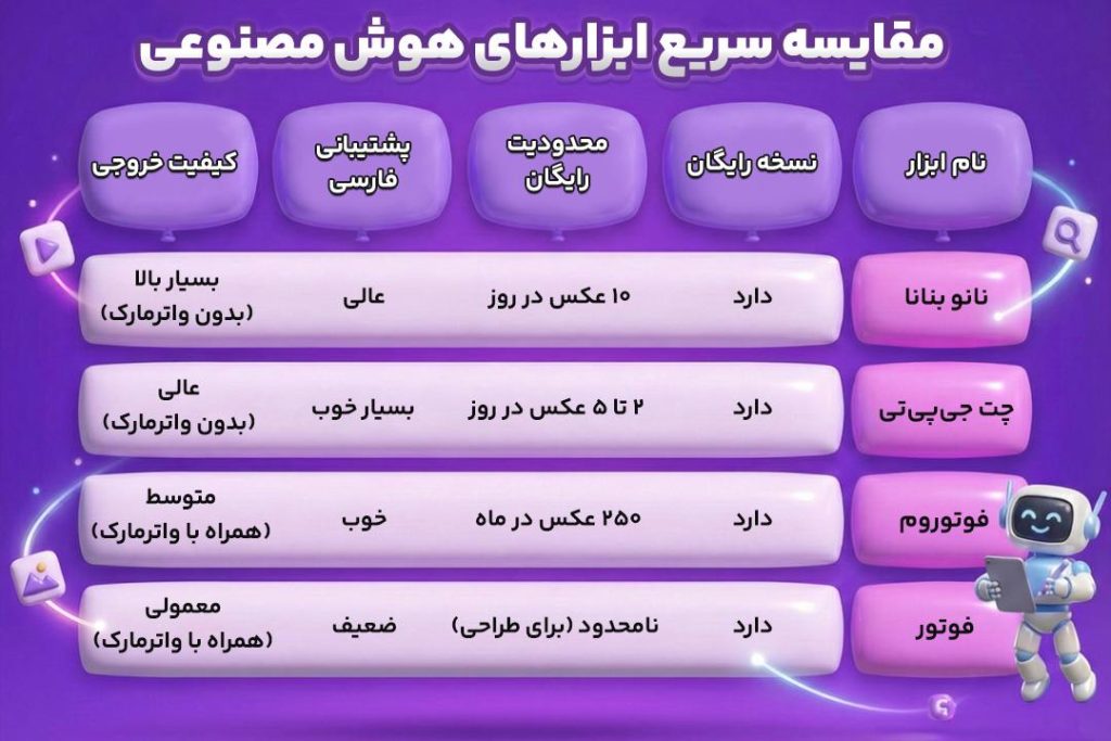 اگر میخواهید در کمتر از 5 ثانیه، فقط با یک پرامپت فارسی، سختترین تغییرات روی عکس اعمال شود، نانو بنانا را انتخاب کنید. مخصوصاً اگر ثبات چهره و محصول برایتان مهم است.
