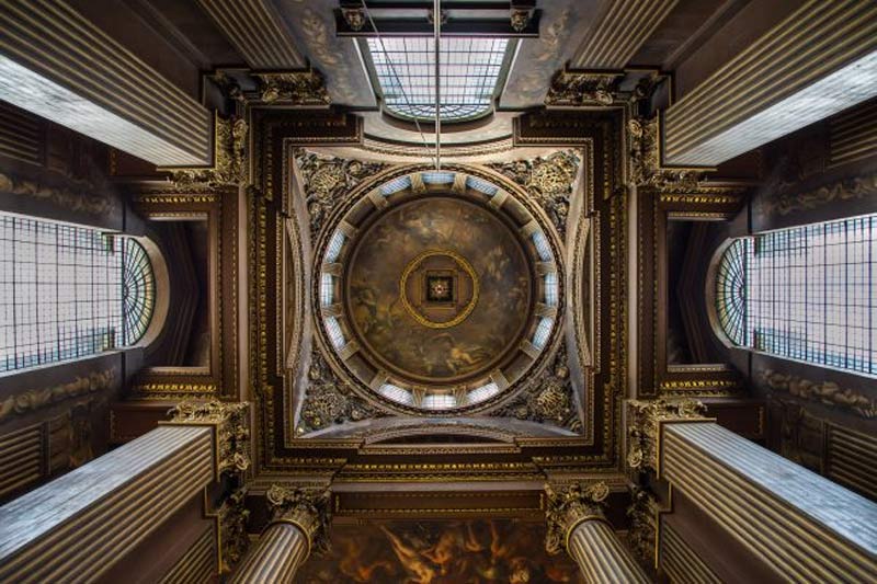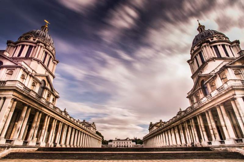 در این تصویر ثبت شده از کالج دریایی سلطنتی قدیمی لندن، یک لنز واید برای برجسته کردن دو ساختمان یکسان و تقارن آنها استفاده شده است. با اینکه تلاش برای گرفتن تصاویر با معماری صاف و مستقیم معمولا خوب است، زاویه اغراق آمیز در این مورد، حس تصویر را تقویت میکند. این زاویه بسیار تاثیرگذار و یک ابزار قدرتمند در ترکیب بندی است.