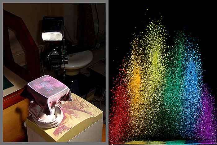 از آنجایی که در این نوع عکاسی لازم است چندین کار را همزمان انجام دهید توصیه می شود از یک دستیار کمک بگیرید. همچنین نظافت مکان عکسبرداری پس از آن همه ریخت و پاش به تنهایی کار آسانی نیست.خلاقیت در به کارگیری لوازم را فراموش نکنید. در عکس زیر از پایه نگه داری صابون، لوله پلاستیکی، کلاه شنای مشکی، چسب پارچه ای استفاده شده و همه آن ها در مجرای هوای بلندگوی ساب ووفر کامپیوتر قرار داده شدند.