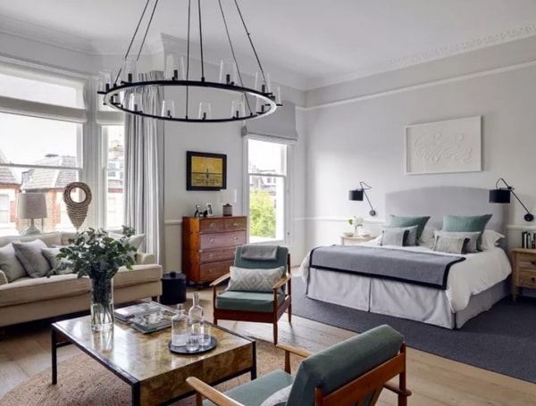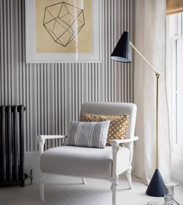 در تصویر زیر مشاهده میکنید که در نمایی دنج، آرام و کاملا سفید، چطور ترکیب یک مبل راحتی نرم و سفیدرنگ با یک چراغ بلند مطالعه مشکی رنگ، یک نقطه عالی برای مطالعه در اتاق خواب را به وجود آورده است. در اینجا میتوان نور اصلی را به کمک یک لامپ مرکزی تامین کرد.