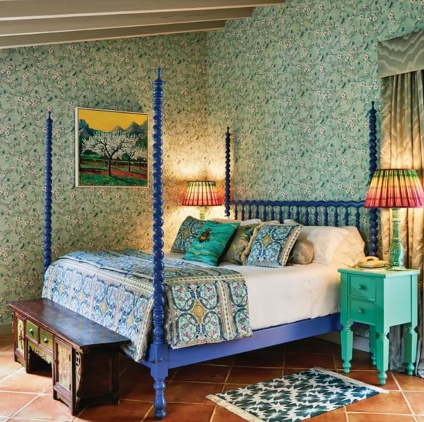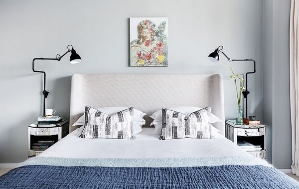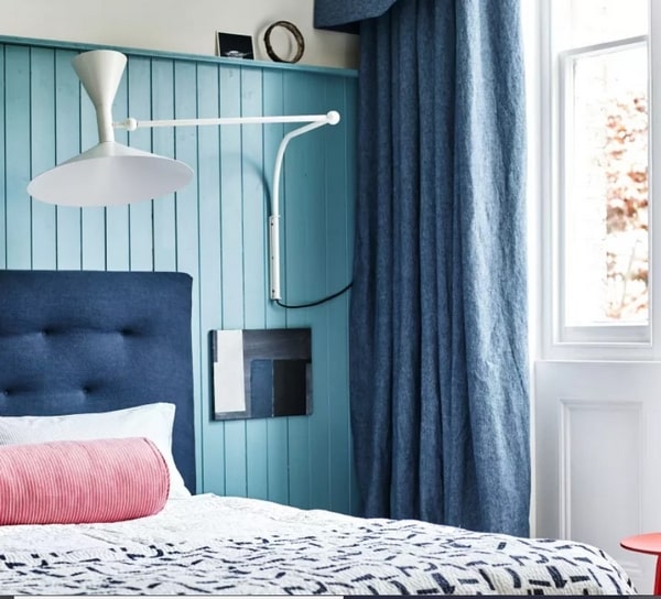 درصورتیکه فضای اتاق خواب این امکان را میدهد، بهتر است از ترکیب یک چراغ پایهدار بلند در گوشه از اتاق کمک بگیرید. در این تصویر یک اتاق خواب آبیرنگ را میبینید که از بافتها و الگوهای به خصوصی در آن استفاده شده است.