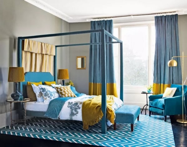 2.ترکیب یک چراغ پایهدار طلایی با لهجه رنگ زرد و آبی اتاق خواب
