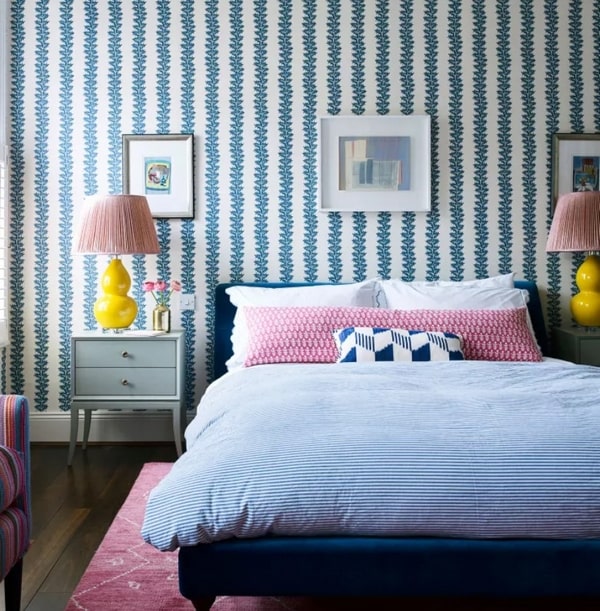 میتوان در اجرای این ایدهها از رنگها، بافتها یا الگوهای کلاسیک و ساده استفاده کرد. علاوه بر این میتوان با طرحهای کلاسیک و تکرارشونده، همه چیز را ساده نگه داشت. درست مثل تصویر بالا که در یک اتاق سفید و آبی با دیوارهای طرحدار، از یک چراغ زرد و صورتی به صورت متقارن استفاده شده است. این تضادها و هارمونی ایجاد شده میتواند فضایی بسیار چشمگیر را در اتاق خواب به وجود بیاورد.