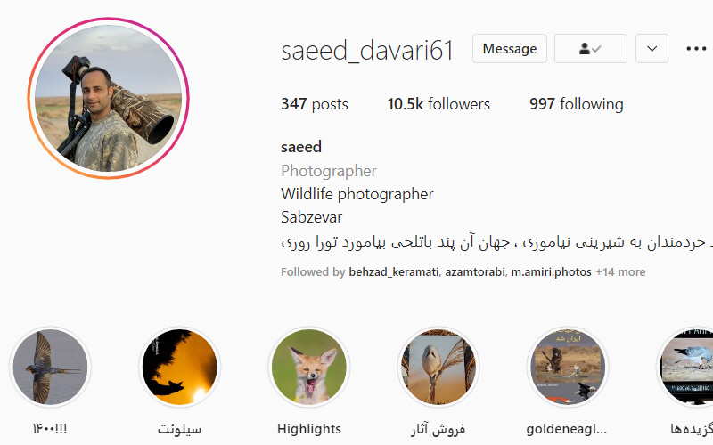 علاقهمندان به طبیعت را به دیدن صفحه اینستاگرام سعید داوری دعوت میکنیم. داوری عکاس حیات وحش و فعال در اینستاگرام است. یافتن عکسهای باکیفیت و حرفهای از طبیعت ایران کار آسانی نیست. به همین دلیل هر کدام از صفحات مربوط به عکاسان طبیعت در ایران ارزشمند هستند. با دیدن عکسهای داوری علاوه بر توانایی او در عکاسی متوجه زحمت زیادی که برای عکاسی حیات وحش گرفته میشود میشوید. او توانسته زیباترین لحظات حیات طبیعی ایران را توسط فیلم و عکس ثبت کند و در صفحه اینستاگرامش برای بینندگان به اشتراک بگذارد. در این صفحه میتوانید کلیپهای بینظیری از شکار و تغذیه شاهین، عقاب و یا زندگی دسته جمعی کبکها را ببینید.