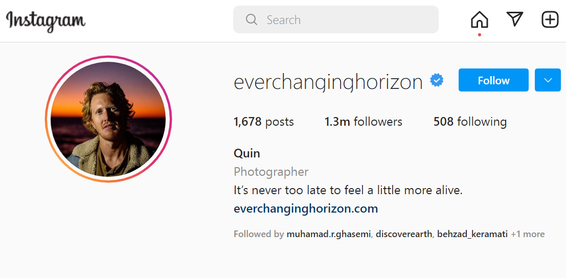 هیچوقت دیر نیست که زندهتر باشیم. نام پیج اینستاگرام او everchanginghorizon است. کوئین شراک متولد آمریکاست. کوئین شراک عکاس شناخته شده در سبک زندگی است. او پس از ترک زندگی معمولی به عنوان یک حسابدار بدون برنامه راهی پرو و سپس سایر نقاط جهان شد و شروع به عکاسی از سبک زندگی و کار مردم جهان کرد. در چند سال گذشته کوین در ون خود زندگی، کار و مسافرت میکند. او برای اپل، گویرو، ادوب و بسیاری از برندهای مهم جهان فیلم ساخته و عکاسی کرده است. داستان پیروزیها و زندگی او الگویی برای هنرمندان شده است.