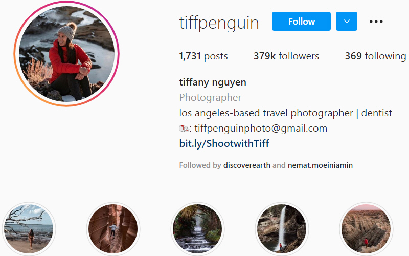 تیفانی نگوین دندانپزشک و عکاس سفری ساکن جنوب کالیفرنیاست. تیفانی عکاسی خود را بر سفر، ماجراجویی، مناظر و سبک زندگی متمرکز میکند و با کشف مکانهای جدید و غوطهور شدن در فرهنگهای ناآشنا عکسهایش را تقویت میکند. تیفانی مجموعههای ارزشمندی از عکس را برای سونی، بی ام و، آمازون و اپل گرفته است.