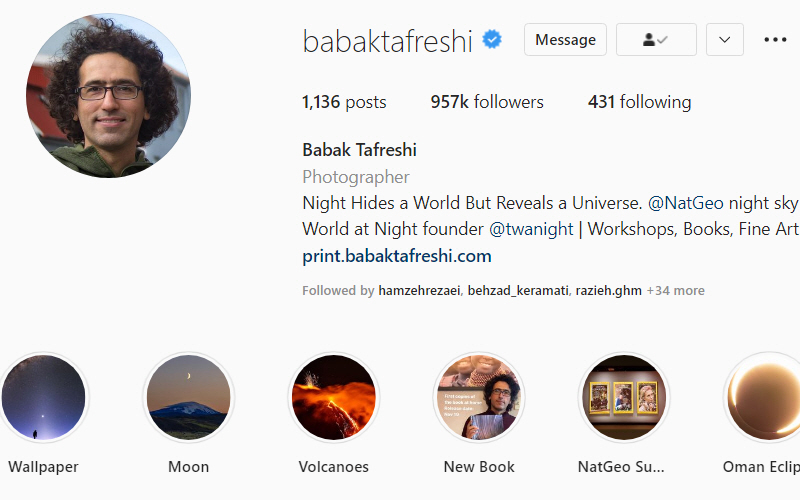 اگر به عکاسی از آسمان شب و نجوم علاقه دارید، صفحه بابک تفرشی را دنبال کنید. بابک امین تفرشی یکی از عکاسان نجوم مطرح در دنیاست که بهترین عکسها را از آسمان گرفته است. او مدیر پروژه عکاسی جهان در شب یا TWAN بوده و بسیاری از عکسهای خود را در پیج اینستاگرامش به اشتراک گذاشته است. بابک تفرشی برای هر عکس خود اطلاعات جامعی از نوع دوربین، لنز و … را به اشتراک میگذارد که میتواند برای عکاسان آماتور دیگر، راهنما باشد.