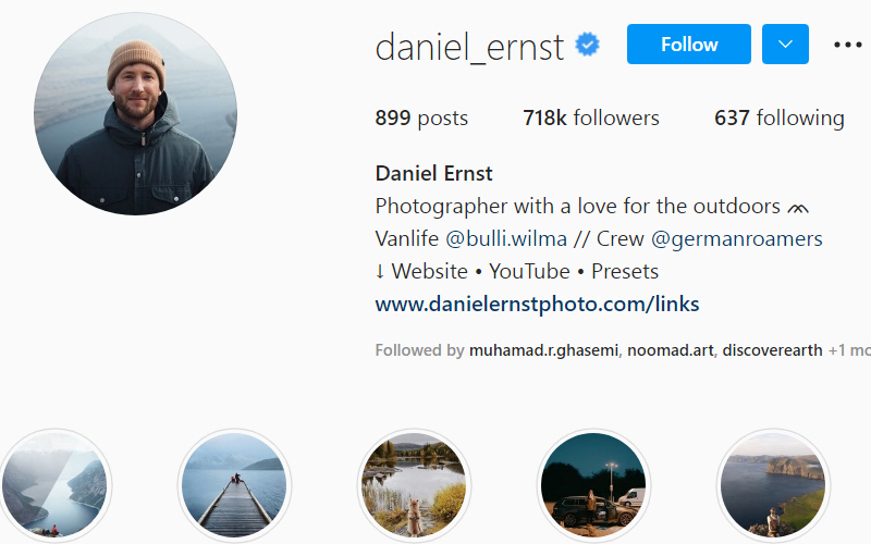 دانیل ارنست یکی از بهترین عکاسان تجاری دنیاست. عکاسانی که علاقهمند به کار حرفهای و درجه یک هستند میتوانند نکات زیادی از دانیل یاد بگیرند. او با 700 هزار فالور یکی از غولهای عکاسی و فیلمسازی تبلیغاتی است. دانیل اصالت آلمانی داشته و دورافتادهترین نقاط طبیعی اروپا را دیده است. رفتن به دنیای بیرون از خانه و کشف و تجربه دوباره طبیعت چیزی است که دانیل تلاش دارد به بینندگانش یادآوری کند.