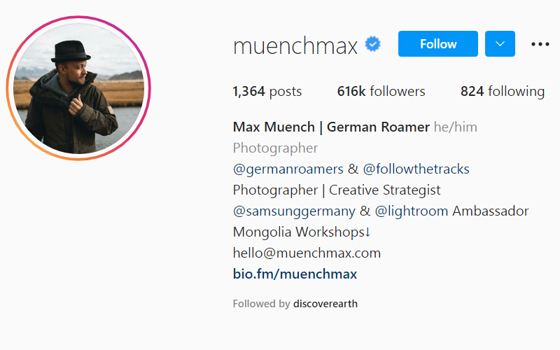 ماکس موئنچ عکاس پرکار و حرفهای ساکن برلین و دارای 600 هزار فالور در اینستاگرام است. برای درک بهتر چرایی معروفیت باید عکسهای بینظیر او از طبیعت دوبی، اردن، روسیه، مغولستان، نروژ و نامیبیا را ببینید. سامسونگ و adobe از مشتریان همیشگی عکسهای مکس هستند. او یکی از بنیانگذاران گروه German Roamers بوده که بزرگترین جامعه عکاسی اروپا است. در سال 2015 او توسط اینستاگرام جزو بهترین عکاسان وب معرفی شد.