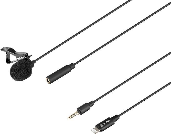 یک کابل تبدیل 3.5 میلیمتری TRS به لایتنینگ و یک میکروفون یقهای با اتصال 3.5 میلیمتری.