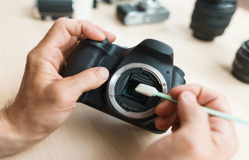 این یعنی باید از یک دمنده ی مناسب برای پاک کردن گرد و غبار موجود بر روی شیشه ی لنز و حسگر دوربین استفاده کرد و برای پاک کردن شیشه ی دوربین و لنز باید از یک دستمال مناسب استفاده شود در واقع باید از ابزارهای مناسبی که برای تمیز کردن حسگر دوربین وجود دارد استفاده کرد. البته همه ی ما مهارت لازم برای انجام این کار ظریف را نداریم. در این موارد، بهتر است برای تمیز کردن آن از افراد حرفه ای کمک بخواهیم.