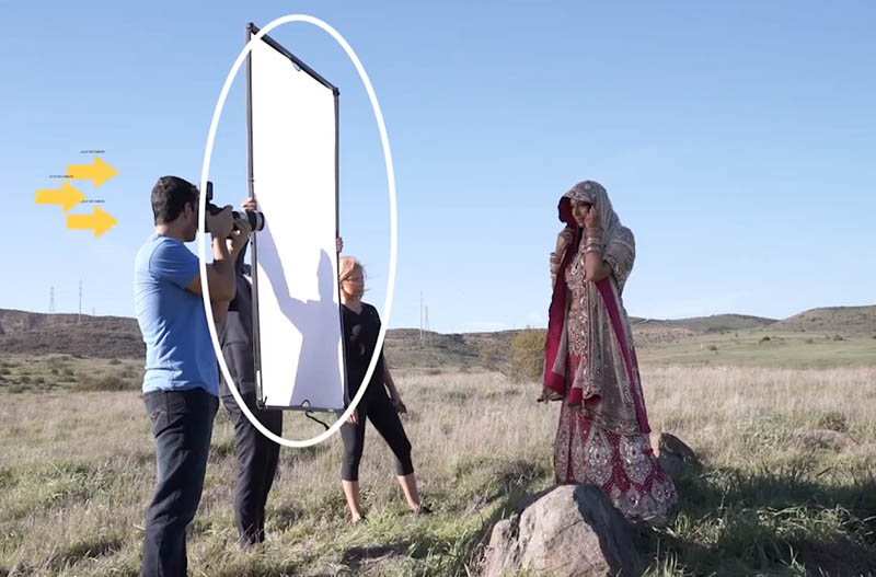 از رفلکتورها برای نورپردازی سوژه و صحنه در فضاهای باز استفاده میشود. رفلکتور را میتوانید بهعنوان نور اصلی، نور پرکننده یا نور لبه استفاده کنید. همراه با رفلکتور میتوانید از نور طبیعی خورشید یا فلاش بهرهمند شوید. برای استفاده از رفلکتور باید نور فلاش را به رفلکتور بتابانید تا بازتاب آن، نوری نرم و ملایم برای سوژه ایجاد کند. رفلکتورها هم نسبتا ارزانقیمت هستند.