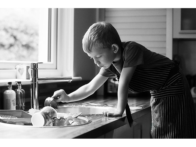 موقعیتهای بسیار فراوانی برای ثبت عکاسی از کودکان در خانه هنگام انجام فعالیتهای مورد علاقه آنها وجود دارد، مانند نقاشی یا انجام کارهای عجیب، در مورد پسر من، شستشوی ظرفهای رنگ پس از پایان نقاشی است.