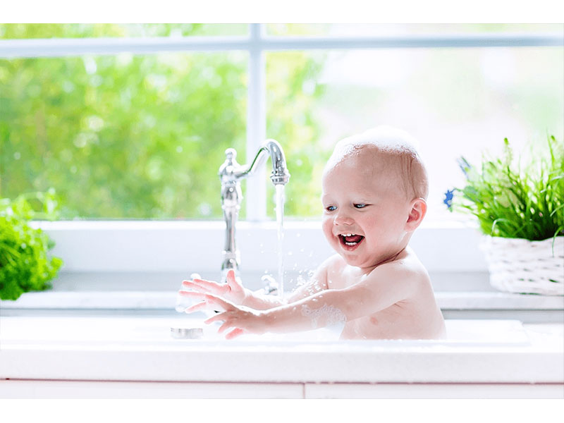 اگر کودکتان به اندازه کافی کوچک است و شما نوری که در حمام دارید را نمیپسندید، به جای حمام میتوانید کودک خود را در سینک ظرفشویی قرار داده و از آن عکاسی کنید.