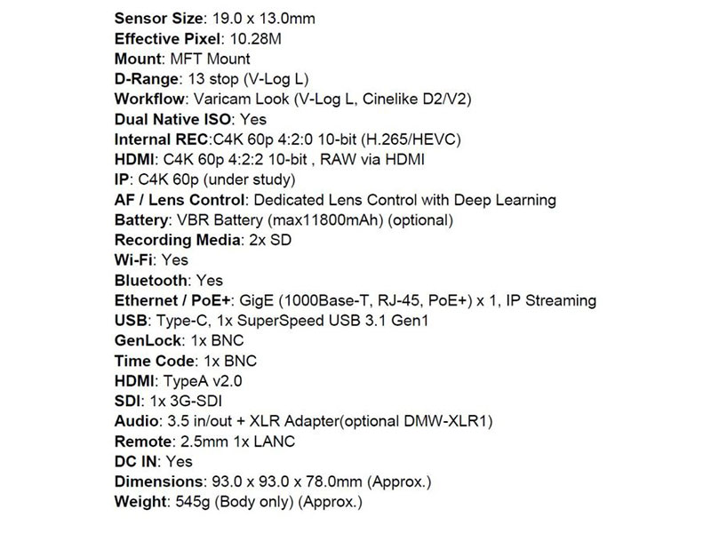 شایعه شده است که این دوربین جدید سینمایی پاناسونیک میتواند دارای C4K60p 4: 2: 2 خروجی 10 بیتی RAW با خروجی HDMI و ضبط داخلی C4K60p 4: 2: 0 10 بیتی باشد.