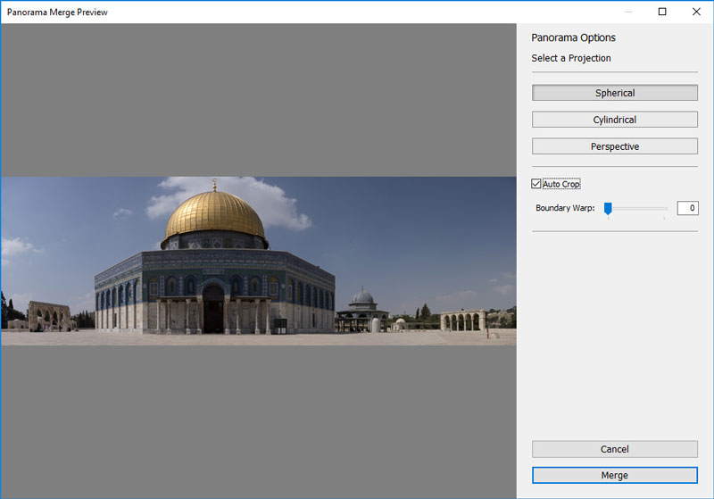 همانطور که میبینید برخلاف نرمافزارهای دیگر، ابزار Photo Merge خیلی ساده است و فقط چند گزینه دارد که شما میتوانید آنها را انتخاب کنید. این موضوع برای افرادی که تازه به عکاسی پانوراما روی آوردهاند خیلی مفید است. شما میتوانید سه گزینه مختلف را برای طرحهای پانورامای خودتان انتخاب کنید: کروی، استوانهای و پرسپکتیو. علاوه بر این سه مورد، دو گزینه دیگر Auto Crop و Boundary Warp نیز در این نرمافزار وجود دارد. در ادامه تمامی این موارد را با جزئیات کامل بررسی خواهیم کرد
