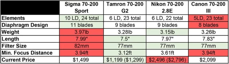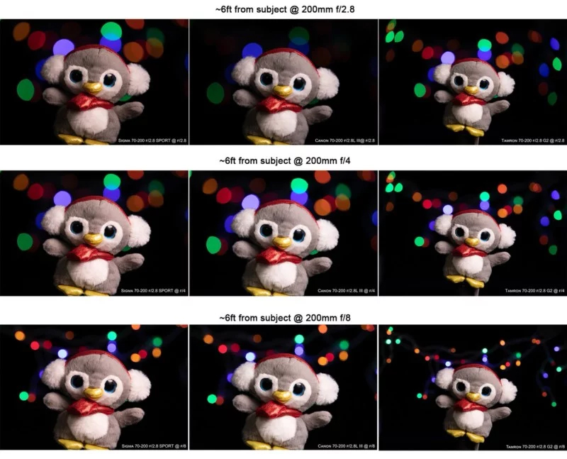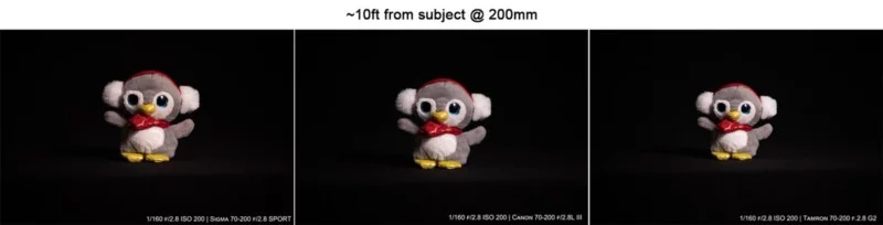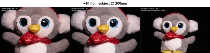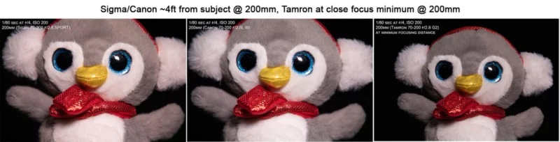 بسیاری از عکاسهای نیکون از مشکل تنفس فوکوس (Focus Breathing) در لنز قدیمی VR II 200-70 شکایت داشتند، مشکلی که در محصولات سیگما و تامرون هم به چشم میخورد. نیکون این مشکل را در لنز 200-70 جدیدش تا حد زیادی مرتفع کرد و کانن هم همیشه یکی از بهترین لنزها را از این نظر داشته است. حالا لنز 200-70 میلیمتری f/2.8 سیگما هم توانسته در جایگاهی نزدیک کانن قرار بگیرد. البته تامرون حداقل فاصله فوکوس کمتری دارد، اما همچنان با مشکل تنفس روبروست و حتی در فاصلهی فوکوس نزدیک، باز هم سوژه بهاندازهی لنزهای سیگما/کانن قاب تصویر را پر نمیکند.