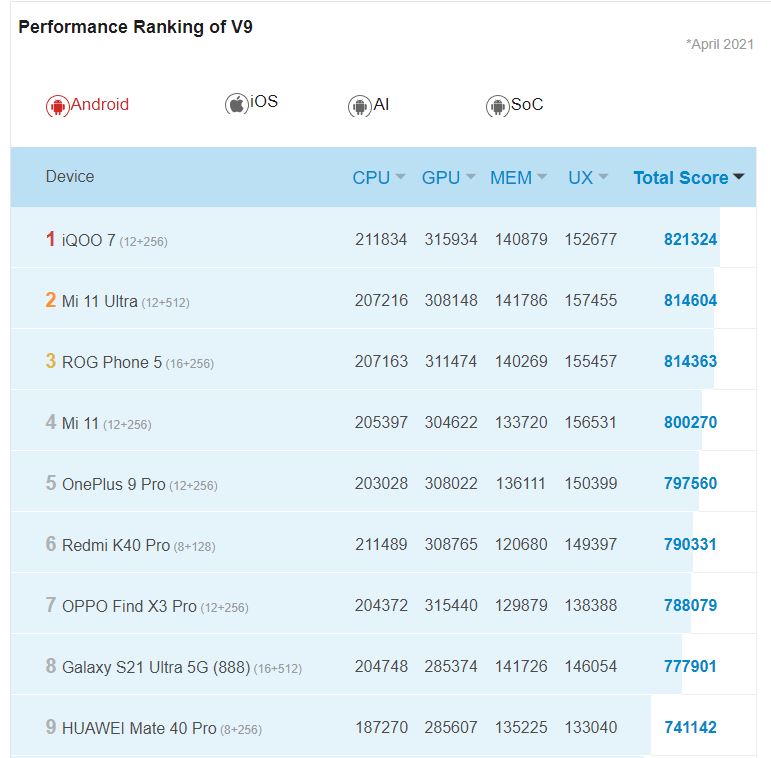 بعد از انجام تست میتوانید به قسمت رنکینگ بروید و امتیاز موبایلتان را با باقی دستگاههای موجود مقایسه کنید.