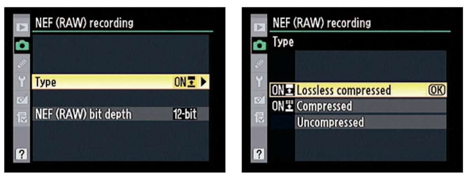 نکتهای که گفتن آن ضروری است این است که بسیاری از دوربینها به شما اجازه نمیدهند خودتان روشهای ذخیرهسازی با عمق رنگهای مختلف را انتخاب کنید و معمولاً در دوربینهای DSLR سطح متوسط، به طور پیشفرض روی 12-bit Loosy Compress قرار دارد، اما در دوربینهای DSLR رده بالا میتوانید 14-bit Loosless Compress را استفاده کنید. بیایید با هم ببینیم که این گزینه در دوربینهای مختلف به چه شکل است؟