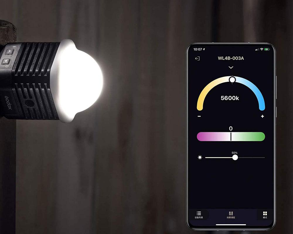 نور ال ای دی WL4Bگودکس را به صورت دستی یا از طریق بلوتوث و با نصب اپلیکیشن Godox Light روی موبایل کنترل میشود. با این برنامه امکان تنظیم میزان روشنایی نور در سه مرحله کم، متوسط و زیاد وجود دارد. همچنین تنظیمات جلوههای ویژه از طریق این اپلیکیشن فراهم است.