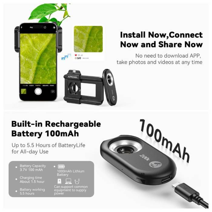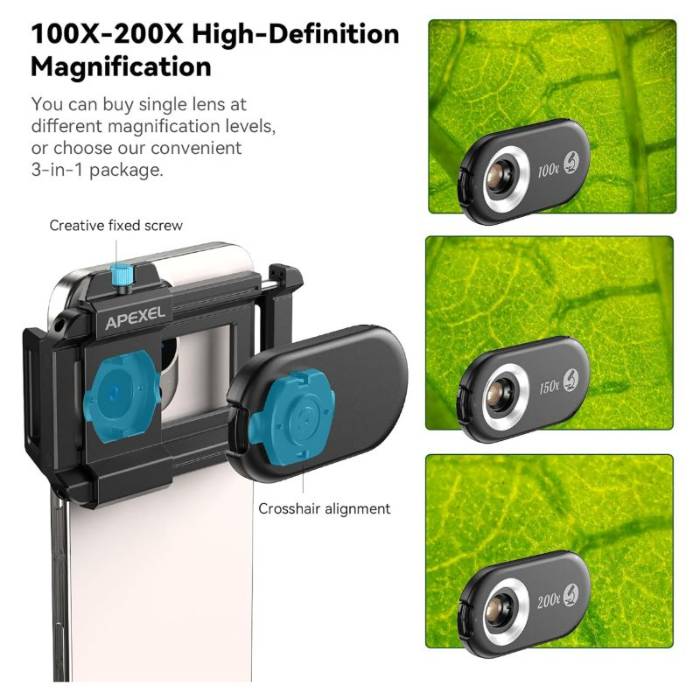 کیت لنز APEXEL 3-in-1 (100x + 150x + 200x) برای موبایل راهحلی پرتابل و حرفهای برای کشف دنیای میکروسکوپی با گوشی هوشمند شماست. این مجموعه شامل سه لنز با بزرگنماییهای 100x، 150x و 200x است که جزئیات کوچکترین سوژهها را با وضوح بالا ثبت میکند. نصب آسان، کیفیت اپتیکال بالا و سازگاری با اکثر گوشیها، این کیت را به انتخابی عالی برای عکاسی علمی، آموزشی و آزمایشی تبدیل میکند.