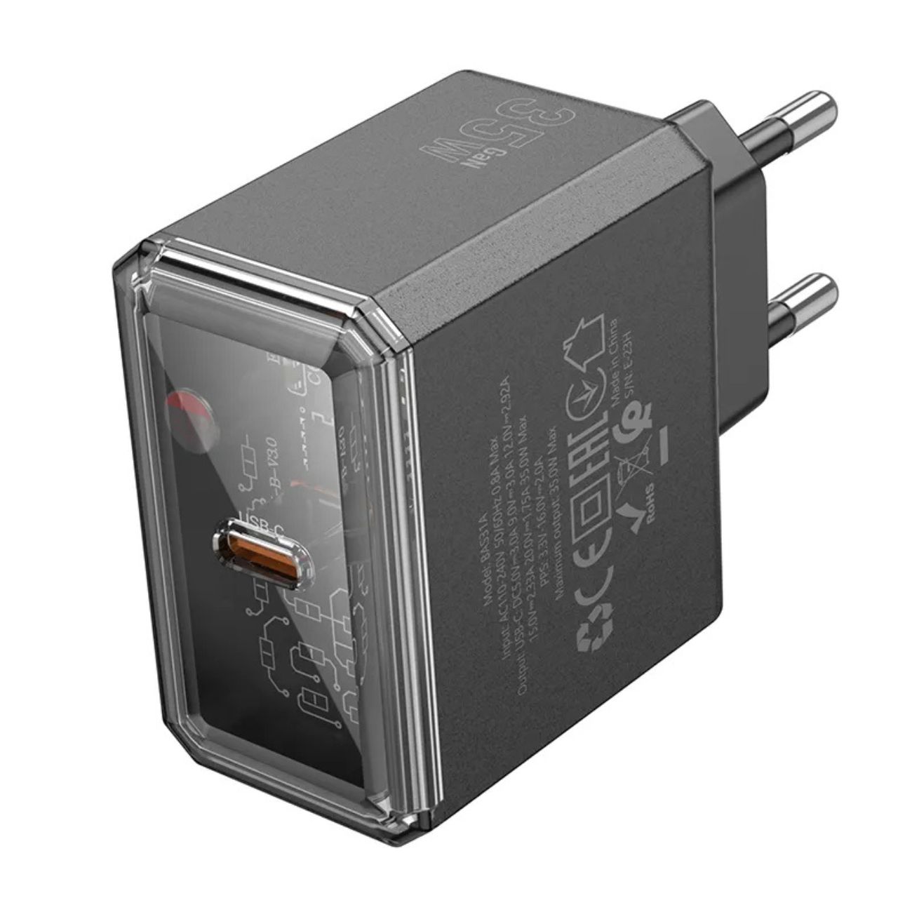 جنس بدنه از ترکیب PC + ABS ساخته شده که مقاومت خوبی در برابر حرارت دارد، در حالی که وزن سبک (64 گرم) و ابعاد جمعوجور (84 × 50 × 30 میلیمتر) آن را به گزینهای بسیار مناسب برای استفاده روزمره تبدیل کردهاند. پایه پین این شارژر از نوع EU است که با پریزهای استاندارد بسیاری از کشورها از جمله برخی از مدلهای موجود در بازار ایران سازگار است.