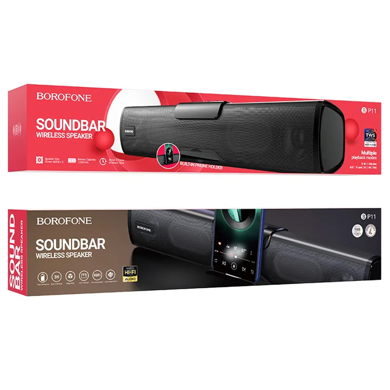 یکی از برجسته‌ترین ویژگی‌های این مدل، هولدر (نگهدارنده) مخصوص تلفن همراه است که به شما اجازه می‌دهد هنگام تماشای محتوا، گوشی خود را به راحتی روی اسپیکر قرار دهید. همچنین، قابلیت TWS (True Wireless Stereo) این امکان را می‌دهد که دو اسپیکر BP11 را به‌صورت همزمان به دستگاه هوشمند متصل کرده و صدایی استریو و دو برابر قوی‌تر ایجاد کنید که برای مهمانی‌ها و فضاهای بزرگتر ایده‌آل است.