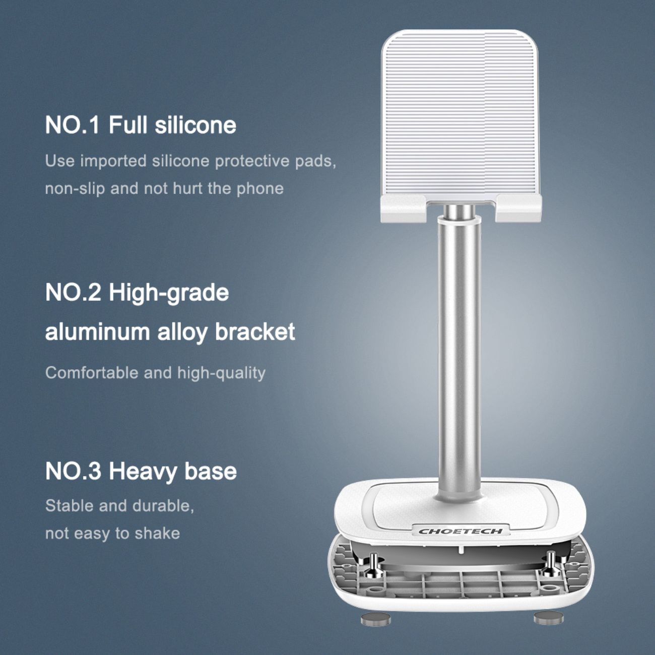 بدنه این استند از آلومینیوم سبک و مستحکم ساخته شده و با پدهای سیلیکونی ضد لغزش پوشش داده شده که از سر خوردن دستگاه جلوگیری میکند. همچنین جایگاه نگهداری طوری طراحی شده که برای شارژ کردن گوشی یا تبلت در هنگام استفاده مشکلی ایجاد نمیکند.