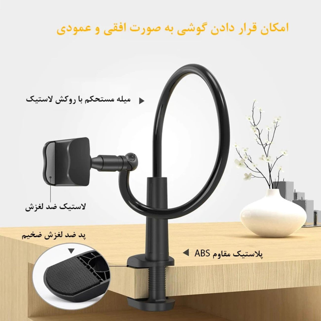 با قابلیت اتصال به تمامی سطوح صاف تا ضخامت ۷ سانتیمتر، شما میتوانید پایه را به میز، اپن، شلف و حتی سطوح بلندتر متصل کرده و گوشی خود را در موقعیت دلخواه ثابت نگه دارید. طول کامل محصول به همراه گیره ۶۰ سانتیمتر است و بازوی خمشونده (Gooseneck) انعطاف بالایی دارد که امکان تنظیم زاویه و ارتفاع دلخواه را به شما میدهد.