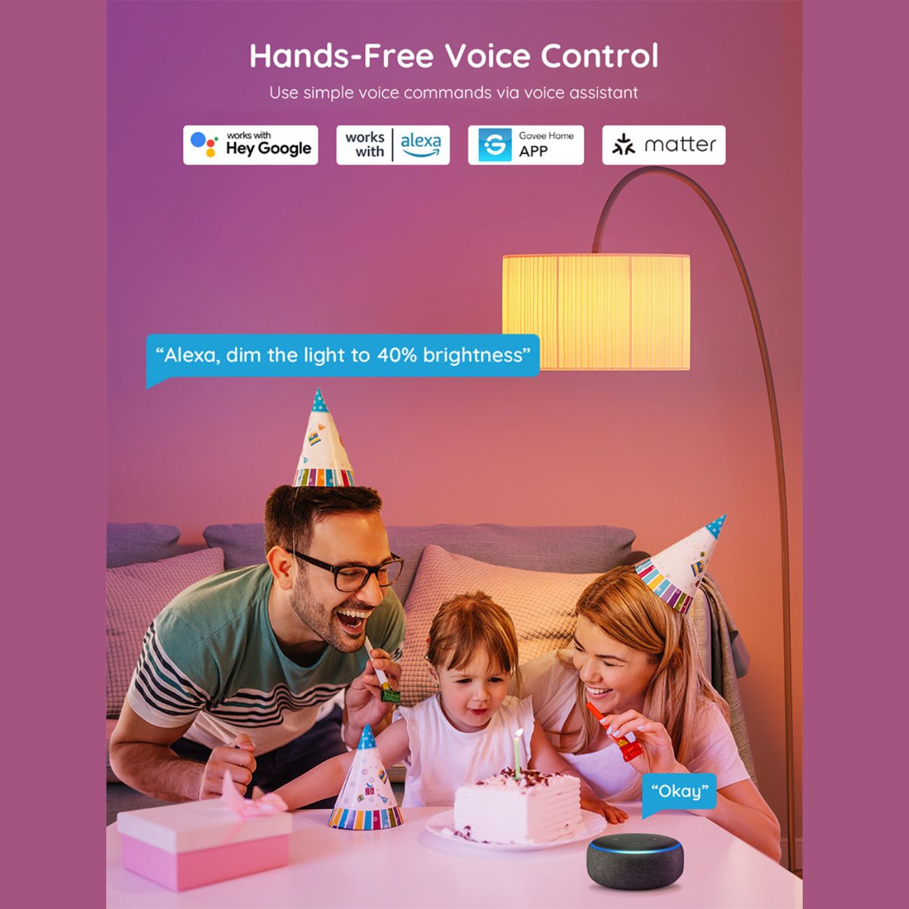 از نظر کنترل هوشمند و اتصال، این لامپ از Wi‑Fi 2.4 گیگاهرتز و Bluetooth پشتیبانی میکند و با اپلیکیشن Govee Home قابل مدیریت است. علاوه بر کنترل از طریق موبایل، کاربران میتوانند از دستیارهای صوتی Alexa و Google Assistant برای روشن و خاموش کردن، تغییر رنگ و تنظیم نور به صورت صوتی استفاده کنند. همچنین امکان زمانبندی روشن و خاموش شدن لامپ و استفاده از حالتهای پیشفرض مانند مطالعه، مهمانی یا حالتهای شخصیسازی شده وجود دارد.