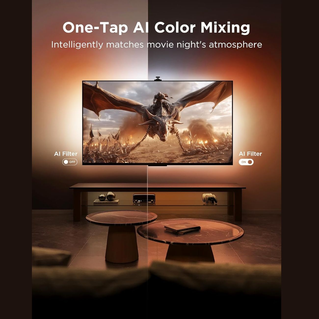 این سیستم نهتنها نور را با رنگهای تصویر تلویزیون تنظیم میکند، بلکه دارای فیلتر هوش مصنوعی (AI Filter) هم هست که میتواند جو و سبک بصری فیلم یا سریال را تشخیص دهد و نور را بر اساس آن تطبیق دهد تا تجربهٔ تماشای شما بیشتر احساسی و درگیرکننده شود. این ویژگی خصوصاً برای صحنههای سینمایی یا بازیهای ویدئویی جذابیت بیشتری میآفریند.