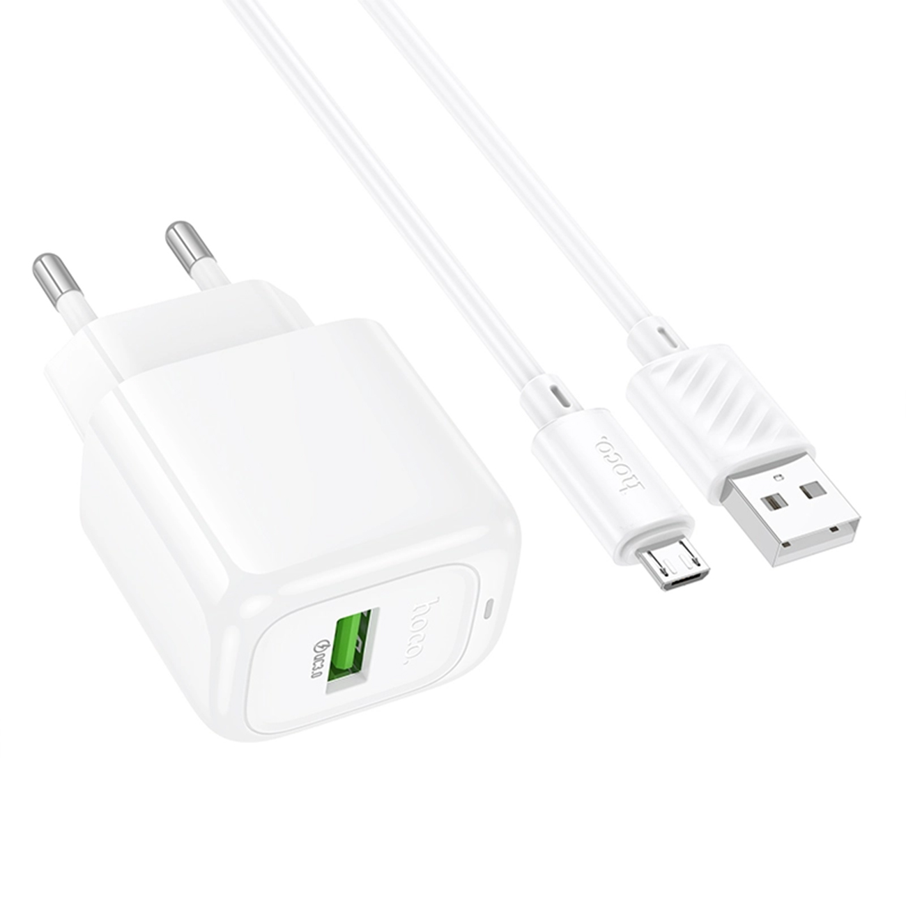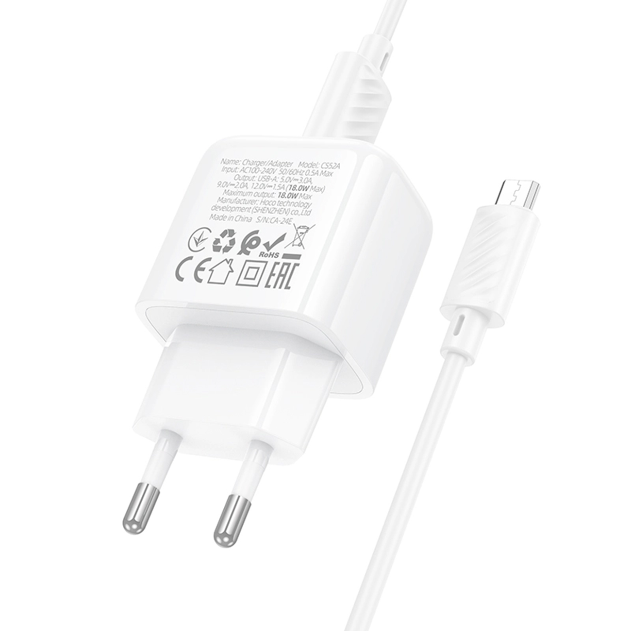 آداپتور هوکو CS52A دارای یک پورت USB-A است و به همراه خود یک کابل 1 متری میکرو USB دارد که نیاز شما به خرید جداگانه کابل را برطرف میسازد. جنس بدنه شارژر از مواد PC و ABS مقاوم در برابر آتش ساخته شده است که علاوه بر دوام بالا، ایمنی دستگاه شما را در برابر نوسانات برق، جریان بیش از حد و اتصال کوتاه تضمین میکند. طراحی با دوشاخه استاندارد اتحادیه اروپا (EU Plug) آن را مستقیماً قابل استفاده در پریزهای برق ایران میسازد. (تصویر شارژر تک پورت به همراه کابل میکرو)