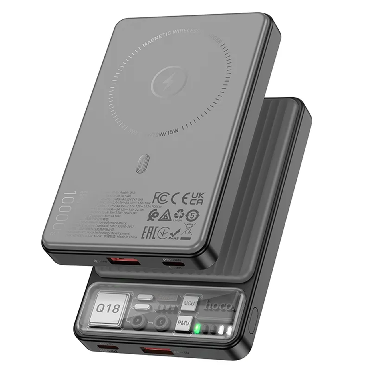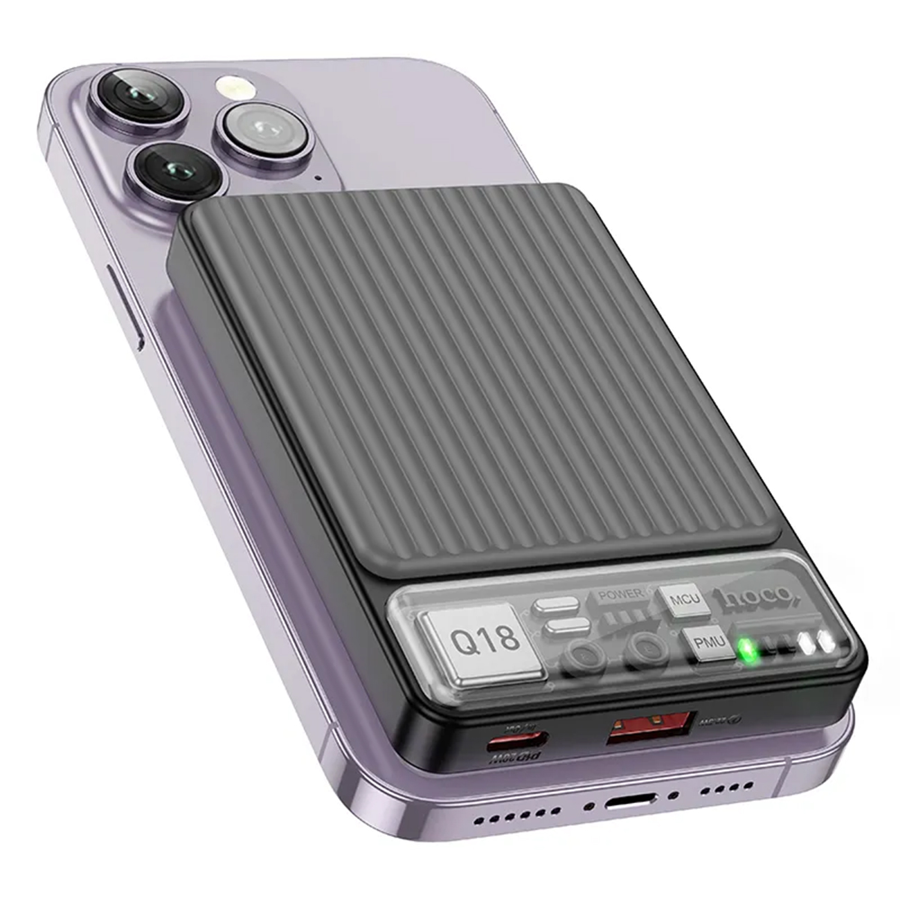 فراتر از شارژ سیمی، هوکو Q18 از قابلیت شارژ مغناطیسی وایرلس (MagSafe) تا توان 7.5 وات برای آیفون‌ها پشتیبانی می‌کند. این ویژگی با مغناطیس قوی، اتصال مطمئنی را تضمین کرده و مشکل حمل کابل را کاملاً از بین می‌برد. همچنین این پاوربانک قابلیت شارژ وایرلس تا 15 وات را برای سایر دستگاه‌های سازگار فراهم می‌کند.