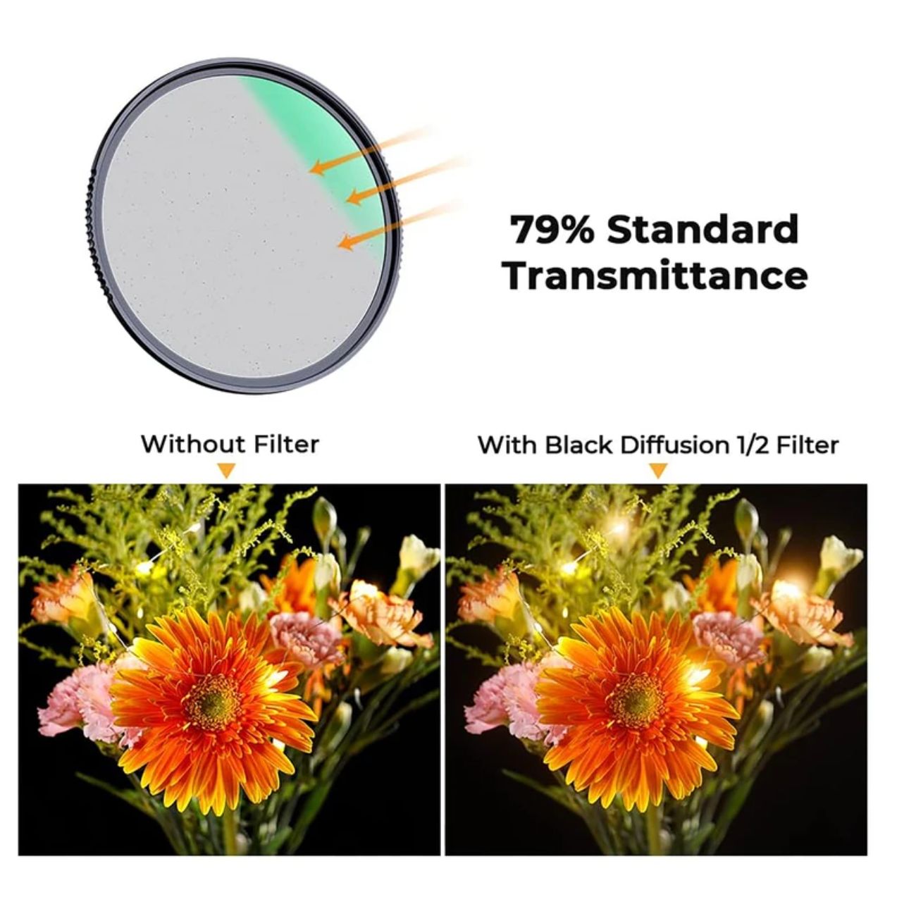 K&F یک برند بینالمللی فعال در زمینهی تولید تجهیزات عکاسی و فیلمبرداری است.فیلتر Black Diffusion یکی از فیلترهای خلاقانه و پرکاربرد در عکاسی و فیلمبرداری است که برای ایجاد جلوهای نرم، سینمایی و رؤیایی در تصویر استفاده میشود.این فیلتر با پخشکردن نورهای شدید و کاهش تیزی هایلایتها، حالتی لطیف و شاعرانه به عکسها و ویدیوها میبخشد، بدون آنکه جزئیات سایهها یا وضوح کلی تصویر را از بین ببرد.در ساختار این فیلتر، ذرات بسیار ریز و تیرهای تعبیه شدهاند که باعث پراکندگی کنترلشده نور در تصویر میشوند.
