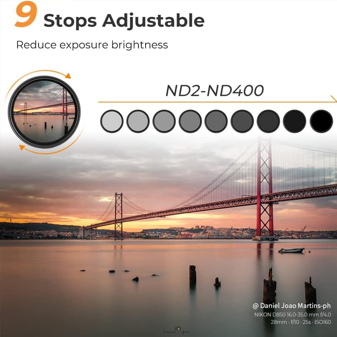 فیلترهای متغیر ND انتخابی استاندارد برای فیلمبرداران جهت کنترل "عمق میدان" و حفظ سرعت شاتر ثابت در محیطهای با نور متغیر هستند. طبق استانداردهای اپتیکال فیلترهای متغیر، دهانه بیرونی این فیلتر یک سایز بزرگتر طراحی شده است؛ بنابراین برای محافظت از فیلتر 72 میلیمتری خود، به درپوش لنز سایز 77 میلیمتر نیاز خواهید داشت.