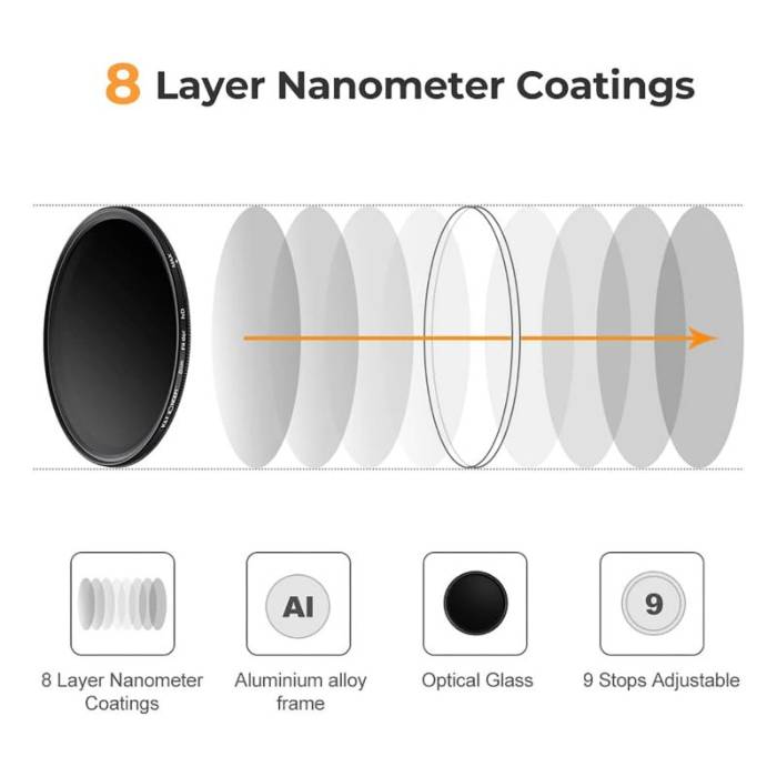 کنترل حرفهای نور در هر شرایط نوری! فیلتر ND متغیر ND2 تا ND400 ایدهآل برای عکاسی و فیلمبرداری با نوردهی دقیق، کاهش نور بدون افت کیفیت و ساختار باکیفیت K&F.