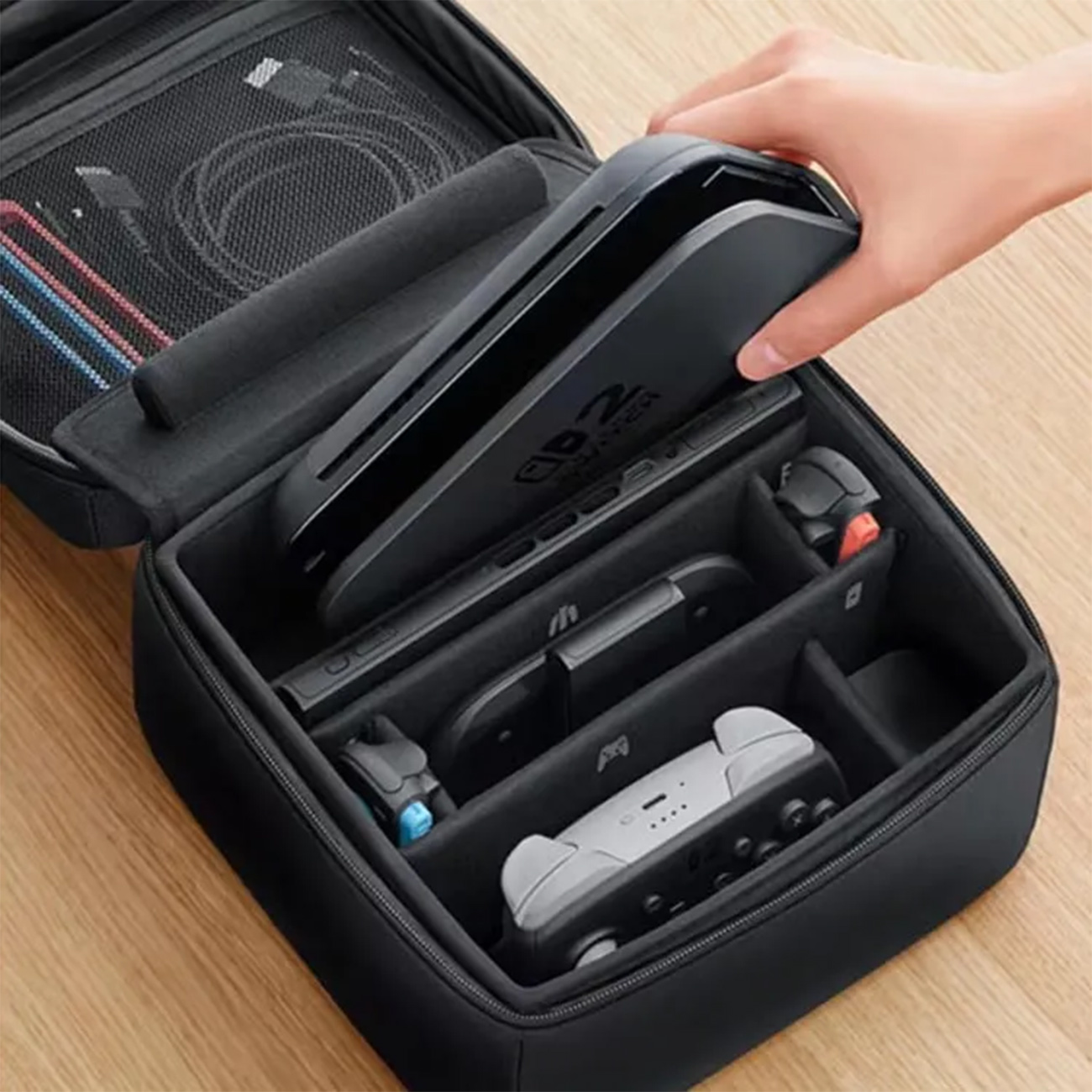 سازماندهی هوشمند لوازم جانبی مهندسی فضای داخلی این کیف به گونهای است که کنسول به همراه جویکانها در جای خود ثابت بمانند. علاوه بر این، فضای اختصاصی برای نگهداری ۶ عدد کارت بازی و دو بند جویکان در نظر گرفته شده است تا گیمر بتواند آرشیو محبوب خود را همیشه همراه داشته باشد. استفاده از زیپهای باکیفیت و طراحی باریک (Slim) باعث شده تا حمل این کیف درون کولهپشتی یا به صورت دستی بسیار ساده باشد. این محصول نه تنها از کنسول، بلکه از تمام لوازم جانبی کوچک شما محافظت کرده و از گم شدن آنها جلوگیری میکند.