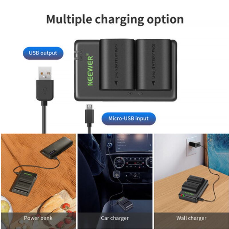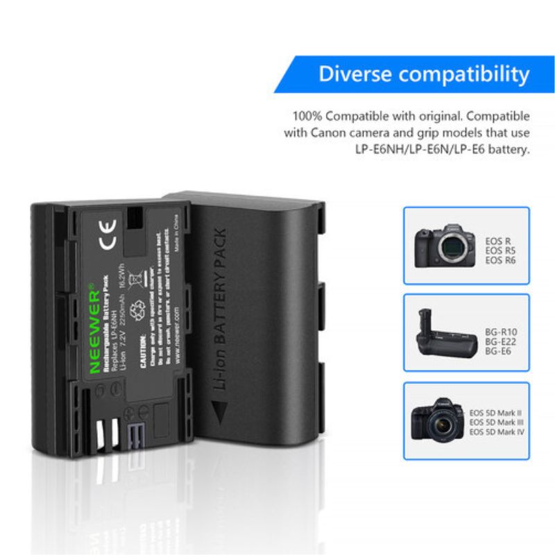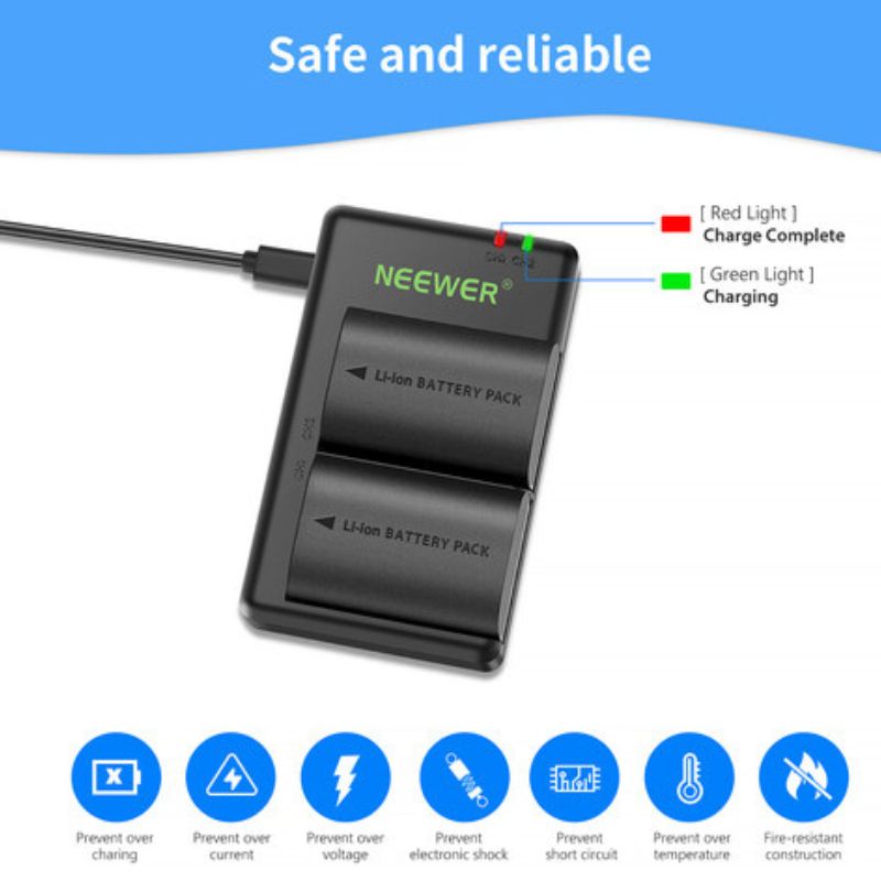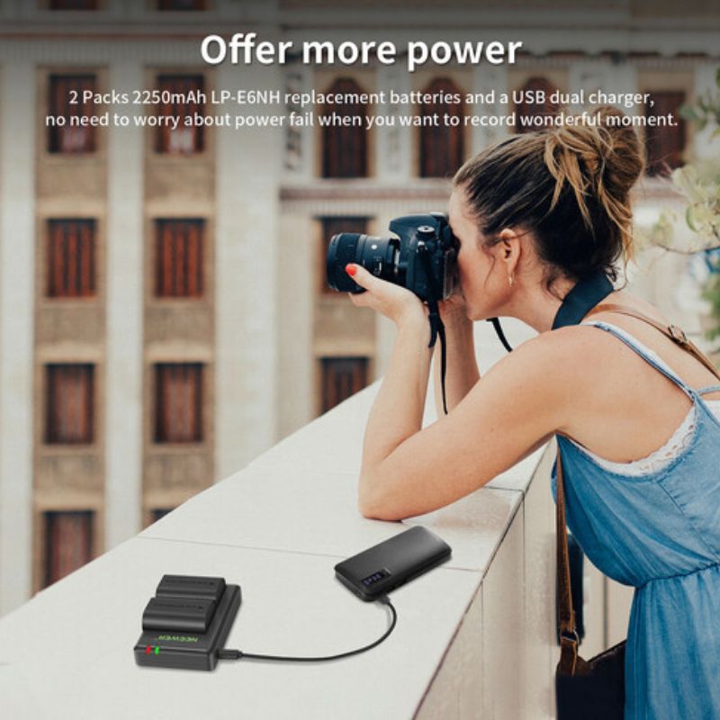کیت شارژ و باتری Neewer 2-Pack LP-E6NH یک راهحل شارژ پشتیبان کامل و کارآمد برای دوربینهای کانن است که از باتریهای استاندارد LP-E6NH/N/E6 استفاده میکنند. این مجموعه شامل دو عدد باتری LP-E6NH با ظرفیت بالا و یک شارژر دو کاناله است که به شما امکان میدهد دو باتری را به صورت همزمان شارژ کنید. شارژر مجهز به نمایشگر LED برای مشاهده وضعیت شارژ بوده و از طریق پورت USB انرژی میگیرد که آن را برای استفاده با پاوربانک، لپتاپ یا شارژر دیواری در سفر بسیار مناسب و قابل حمل میکند.