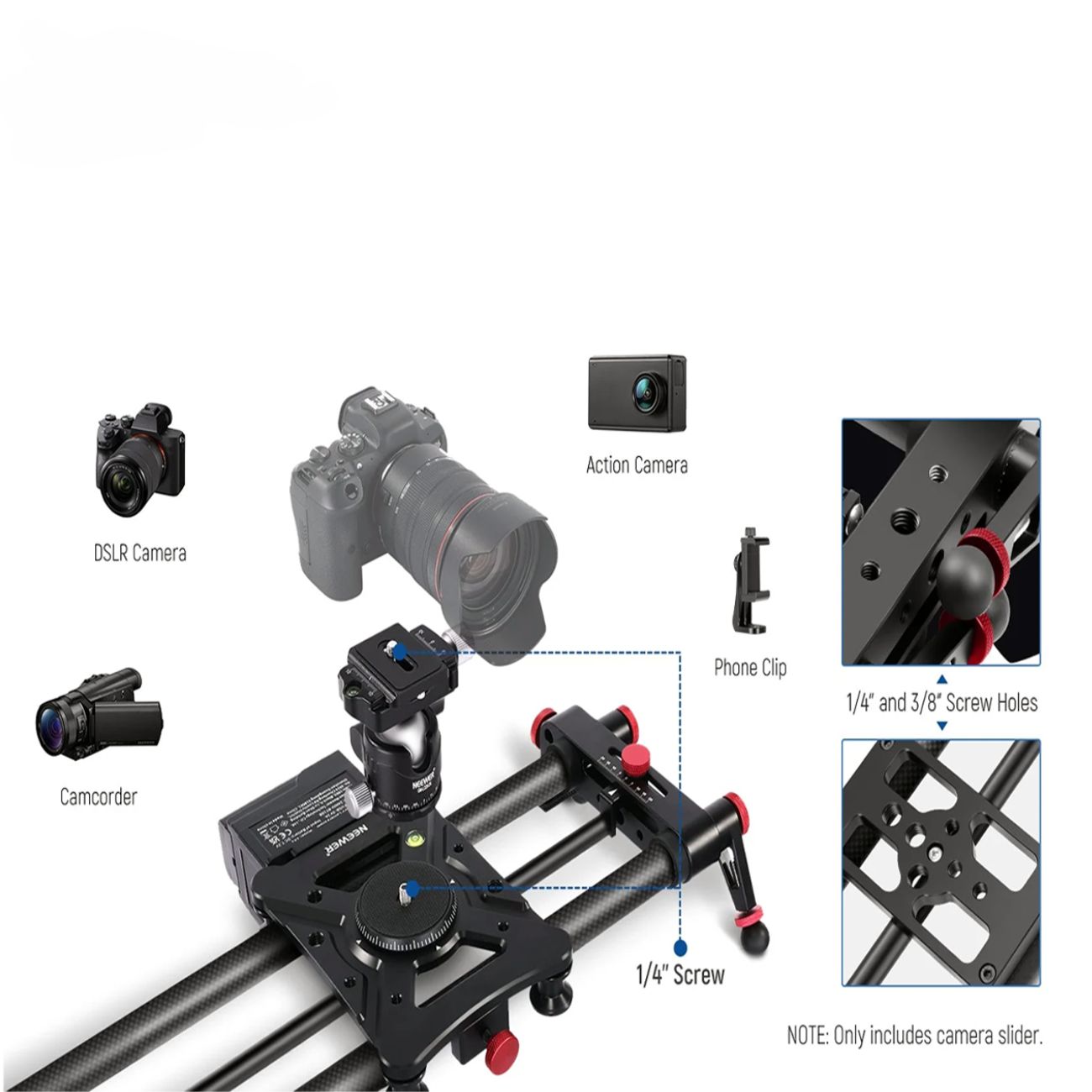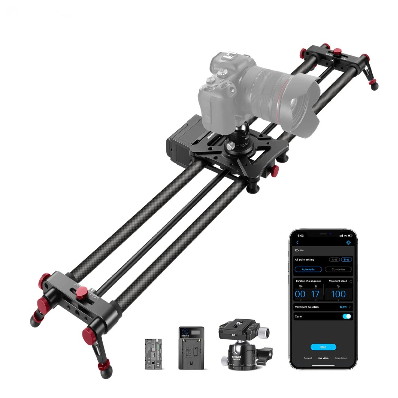 موتور این دستگاه به گونهای طراحی شده که کمترین صدای ممکن را تولید کند، بنابراین در هنگام ضبط صدا با میکروفونهای روی دوربین، مشکلی ایجاد نخواهد شد. سیستم کنترلی ER1 به شما اجازه میدهد نقاط شروع و پایان را مشخص کنید، سرعت حرکت را تنظیم نمایید و حتی برای عکاسی تایملپس، شاتر دوربین را با اسلایدر هماهنگ کنید. وجود ریل مرکزی قابل تنظیم، امکان ثبت تصاویر پانوراما یا فوکوس روی سوژه (Parallax) را در حین حرکت اسلایدر فراهم میآورد.