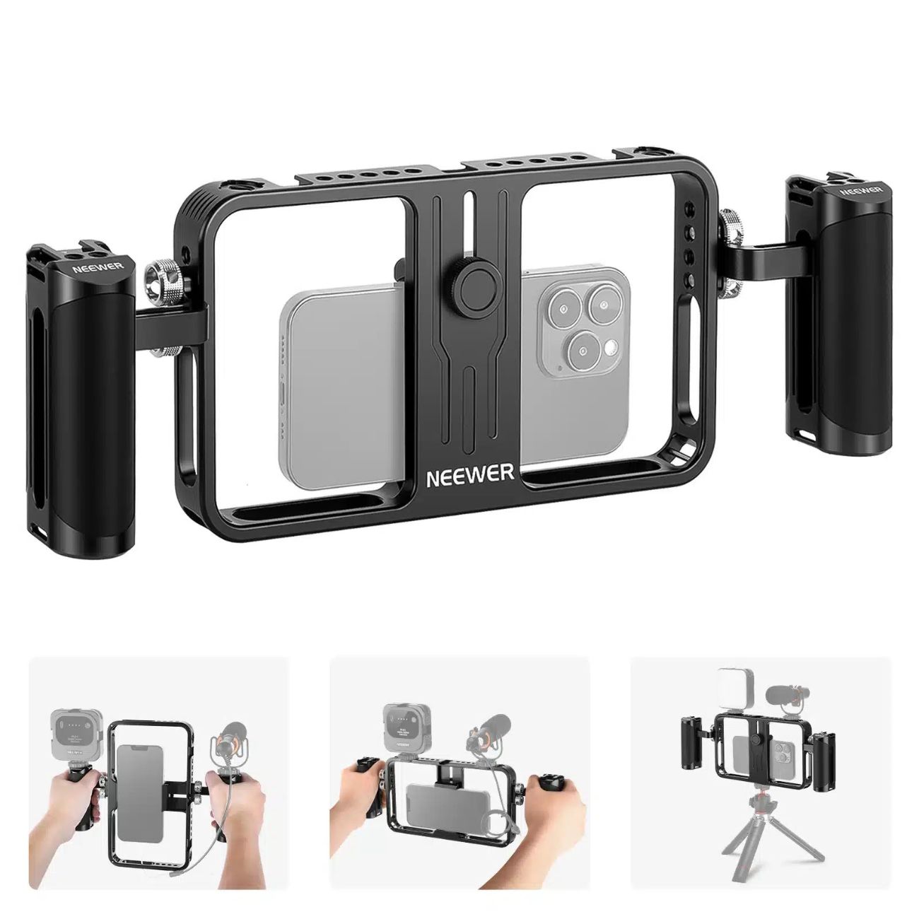کیج موبایل نیور CG100 + VS105 یکی از ابزارهای حرفهای و منعطف برای تولید محتوا، ویدئو بلاگری، فیلمبرداری وصنع محتوا با گوشیهای هوشمند است. این ریگ به کمک نقاط اتصال متعدد، دستگیرههای ارگونومیک و ساختار سبک و مستحکم، تجربهای حرفهای از فیلمبرداری موبایلی را فراهم میکند.