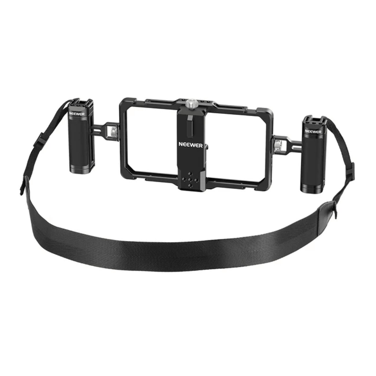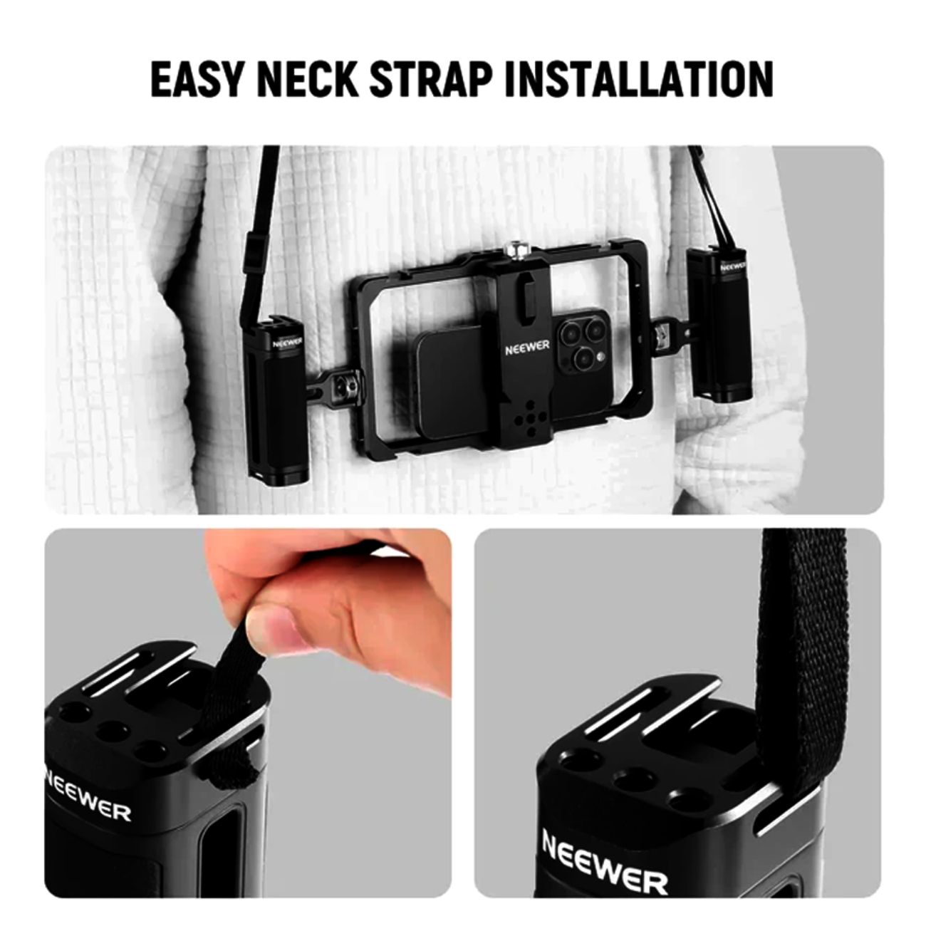 کیج Neewer PA009S با بدنهای از آلیاژ آلومینیوم مقاوم ساخته شده که در برابر خوردگی، ضربه و سایش مقاومت بالایی دارد. این بدنه سبک، باعث میشود تا هنگام فیلمبرداری طولانیمدت هیچ سنگینی غیرضروری احساس نشود. سیستمهای نصب متعدد مثل رزوههای ۱/۴ اینچی و دو Cold Shoe به شما امکان میدهند تا مجموعهای از لوازم جانبی مانند میکروفون، چراغ LED، مانیتور، یا دستههای جانبی را متصل کنید، بدون اینکه نیاز به ابزار اضافی داشته باشید.